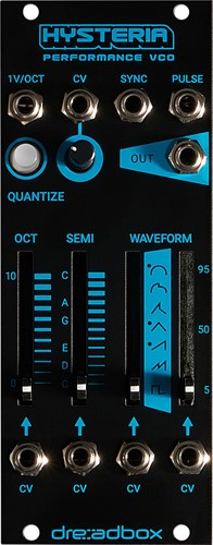 Hysteria Blacklight är en analog oscillator i Eurorack-format som är utrustad med Variable Voltage Controlled Wave Shaper, Voltage Controlled Quantizer som ser till att oscillatorn alltid är stäm, Hard Sync-ingång och separat Pulse-utgång som ger klocka eller synk till andra moduler. Hysteria är 10HP bred och 35 mm djup.