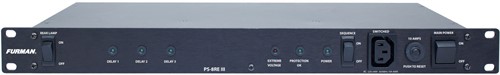 The PS-8RE III Power Conditioner/Sequencers is capable of powering up a rack full of equipment in a 3-step delayed sequence. The sequence is reversed for power-down. The sequence can be initiated with either momentary or maintained switches, locally or remotely. A duplex outlet is provided for each delay step. One or more Furman PS-8R E II’s may be installed in remote locations and operated via low-voltage wiring.