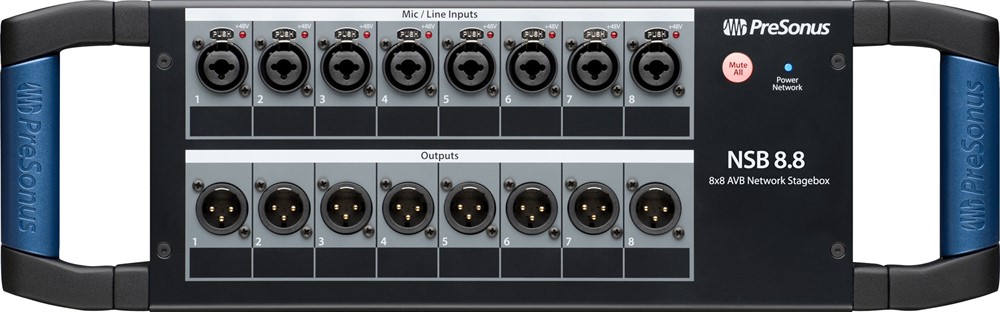Designed to work seamlessly with PreSonus® StudioLive® Series III mixers, the PreSonus NSB 8.8 stage box offers 8 locking combo mic/line inputs with remote-controlled XMAX preamps that include gain compensation for shared input scenarios. All inputs can be controlled from a StudioLive Series III console and from free PreSonus Universal Control software. All eight outputs employ locking XLR jacks. A built in 2-port AVB switch lets you daisy-chain multiple units. A rugged steel chassis with sturdy handles and a stage box form factor allow the NSB 8.8 to sit well on the stage and survive the rigors of the road. The unit can be rack mounted with an optional rack-ear kit.