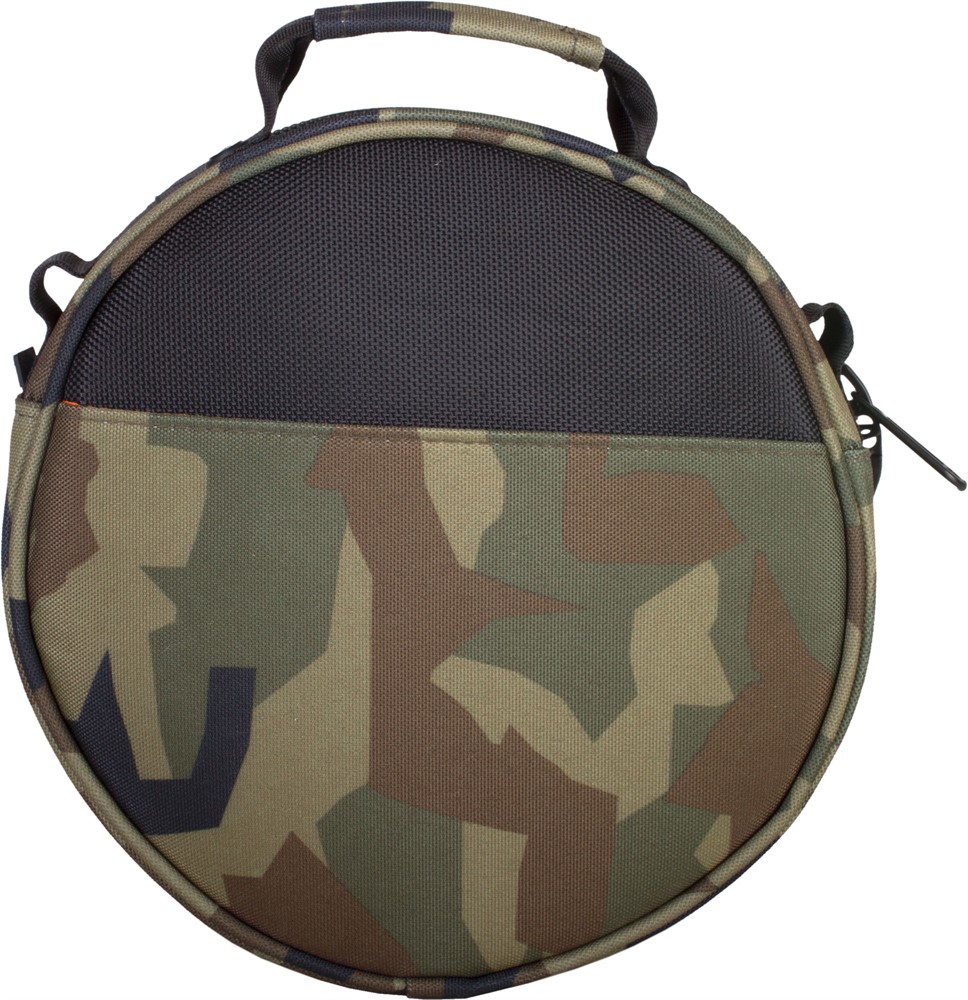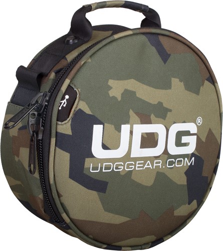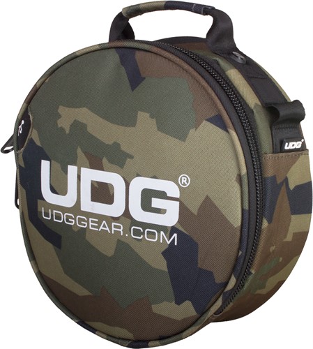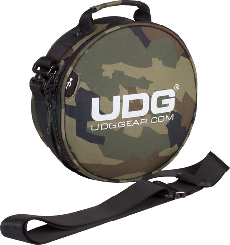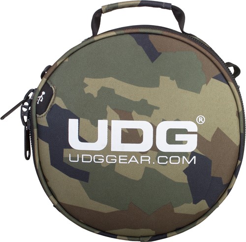 Padded headphone case made of water-resistant ballistic nylon. Holds most foldable DJ headphones. Detachable and adjustable shoulder strap. Pockets for small accessories. Camouflage finish.