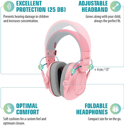 Alpine Muffy Kids is designed to protect the extra sensitive hearing of children aged 5 to 16 against damaging noise. The earmuffs can be used in noisy environments, such as parties, parades, fireworks shows, concerts, and car and motorcycle races. The small earmuffs for children also provide noise reduction to improve concentration, for instance in noisy classrooms. The headband is adjustable and features a soft lining. Alpine Muffy Kids earmuffs are available in five new, trendy colours. The outer layer of the colourful earmuffs is made from plastic and therefore easy to clean. The earmuffs can be folded, so they are easy to take along. Make your child feel comfortable and safe.