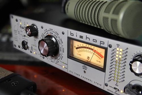 BISHOP all tube channel unit brings much more than you expect from a regular high quality channel strip. The heart of the unit based on the mic preamp which consist three vacuum tubes constructed in all tube design. There are inputs for the mic and instrument on the front while mic and line also selectable on back panel. Over the regular switches of phase, polarity and phantom power we found a special drive pot which is available for colouring the instrument input through a discrete solution. The big enlighted eye catching ring for stepped gain selector is separated in two selectable scales which gives ultimate capabilities to make gain even until +60dB.