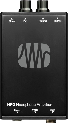 Personal headphone amplifier. 2 XLR female inputs. 1 Mini TRS headphone output. 9V battery or DC power supply. Volume and Pan control. Stereo/mono switch.