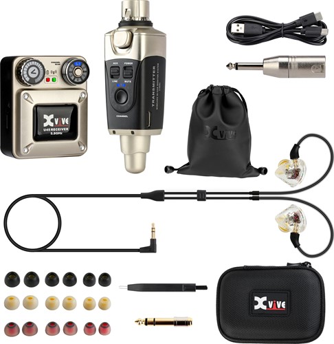 The U45T9 is a bundle that includes the Xvive U4 wireless in-ear monitoring system and Xvive T9 in-ear monitors.