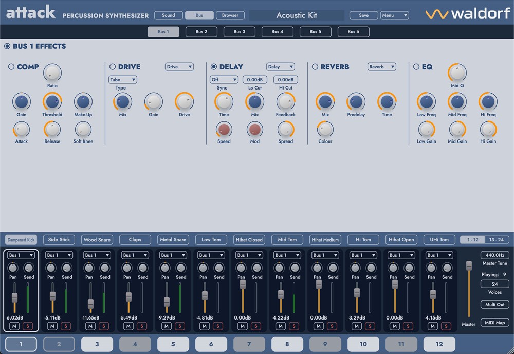The effects section has grown into a true sound-design powerhouse, delivering 24 individual sounds per kit, with 12 sounds playable polyphonically as pitched instruments. Each of the 24 sounds now features its own insert effects, while six output busses provide additional processing. Per sound, a dedicated compressor and EQ are paired with a freely selectable effect from Chorus, Delay, Reverb, Drive, Phaser, or Flanger. Each output bus adds its own compressor, EQ, and three additional effects, allowing users to sculpt their entire kit with studio-grade depth and polish.
